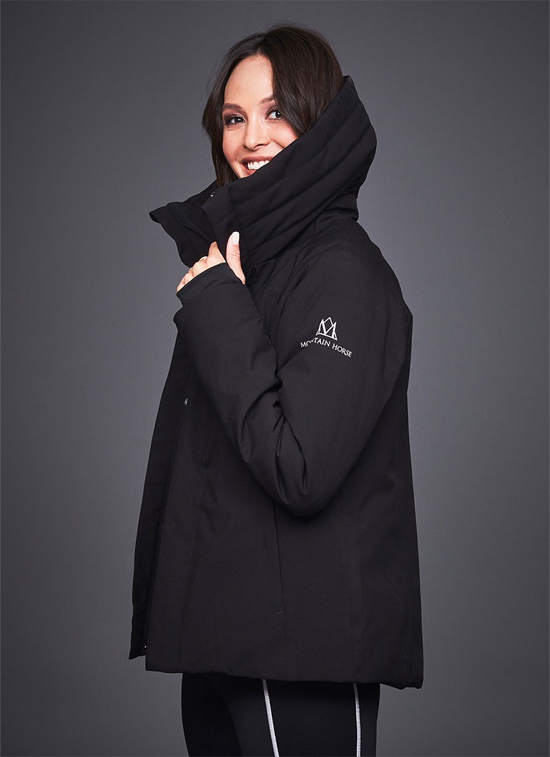 Reflecterend Mountain Horse logo op de linkermouw en siliconen logo langs de kraag.