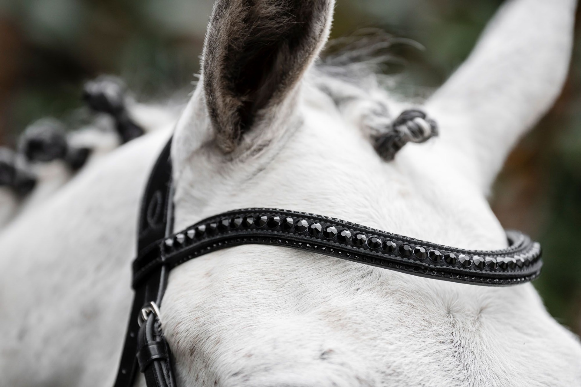 Het hoofstel heeft een wave frontriem die voorzien is van zwarte strass steentjes.
