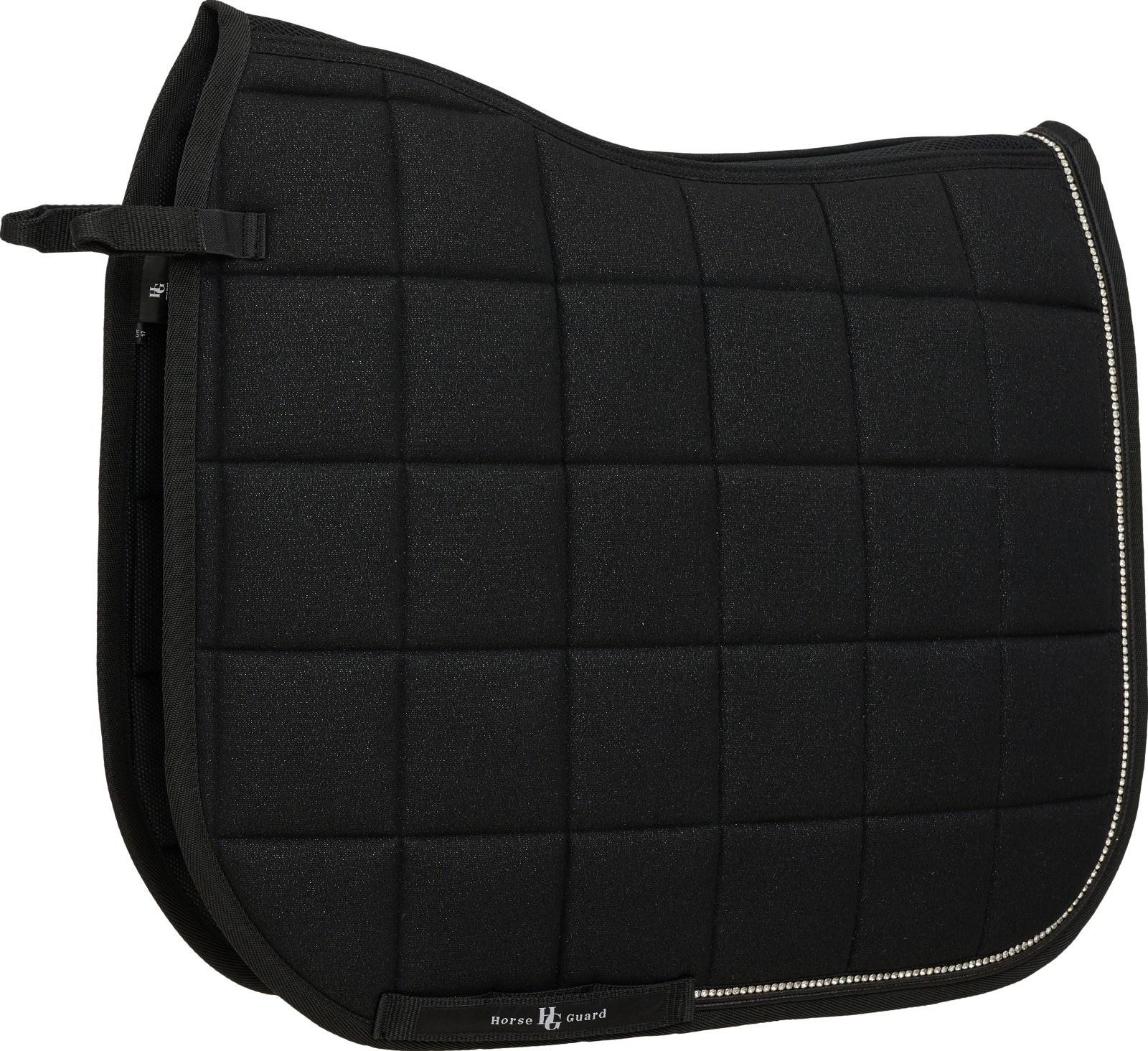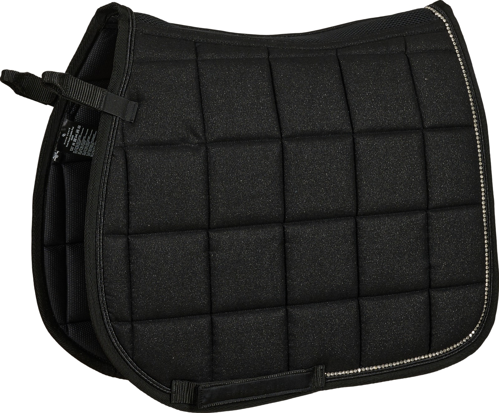 Zeer chique zadeldek met een prachtig glittereffect, zwarte piping en strasssteentjes langs de rand.